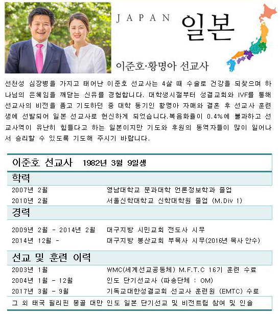 이준호 황명아 선교사 일본 파송 안수
