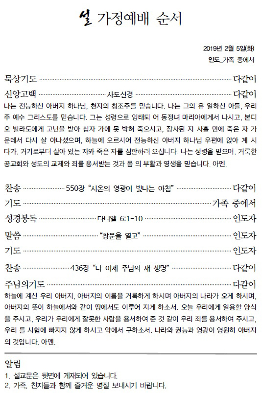 2019 설 가정예배 순서지